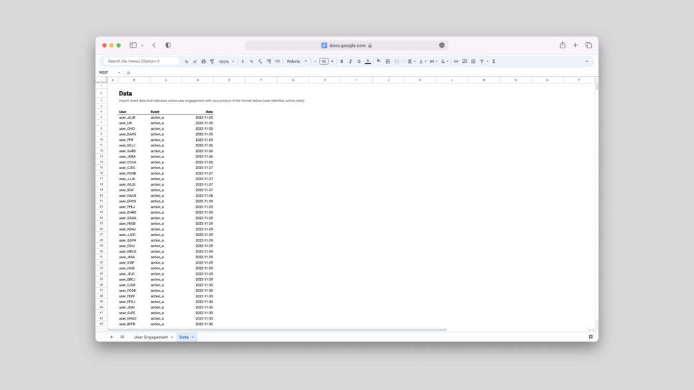 Get started: Start with the data sheet. Get your data in the same format (user identifier, action, and date). Import a csv from the data source or connect it directly. There are many tools out there to do it for you. If you need help, we are happy to help with initial implementation.