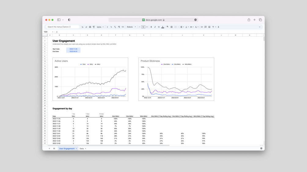 .. a visualization sheet including charts that show daily, weekly, and monthly active users